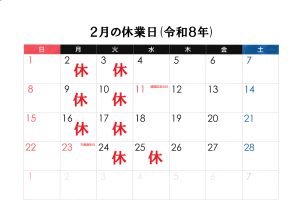 2月の休業カレンダー(令和8年)