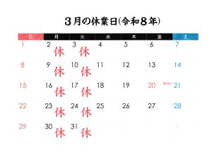 3月の休業日カレンダー(令和8年)